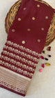 Elegant and timeless, this cotton silk blend Banarasi saree beautifully combines the richness of traditional weaving with everyday comfort. Adorned with delicate zari buttas across the body and finished with a charming woven border featuring small bird motifs, it reflects fine craftsmanship and subtle elegance. The breathable yet lustrous fabric offers a graceful drape, making it perfect for both festive occasions and refined daily wear.
