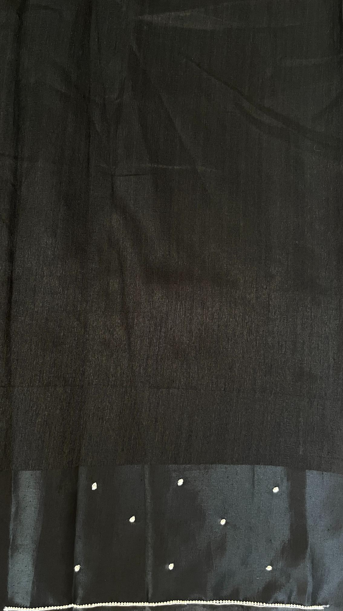 Elegant and timeless, this raw silk saree is beautifully enhanced with intricate hand-crafted bead work that adds a subtle touch of shimmer. The rich texture and graceful drape make it a perfect choice for refined and special occasions.