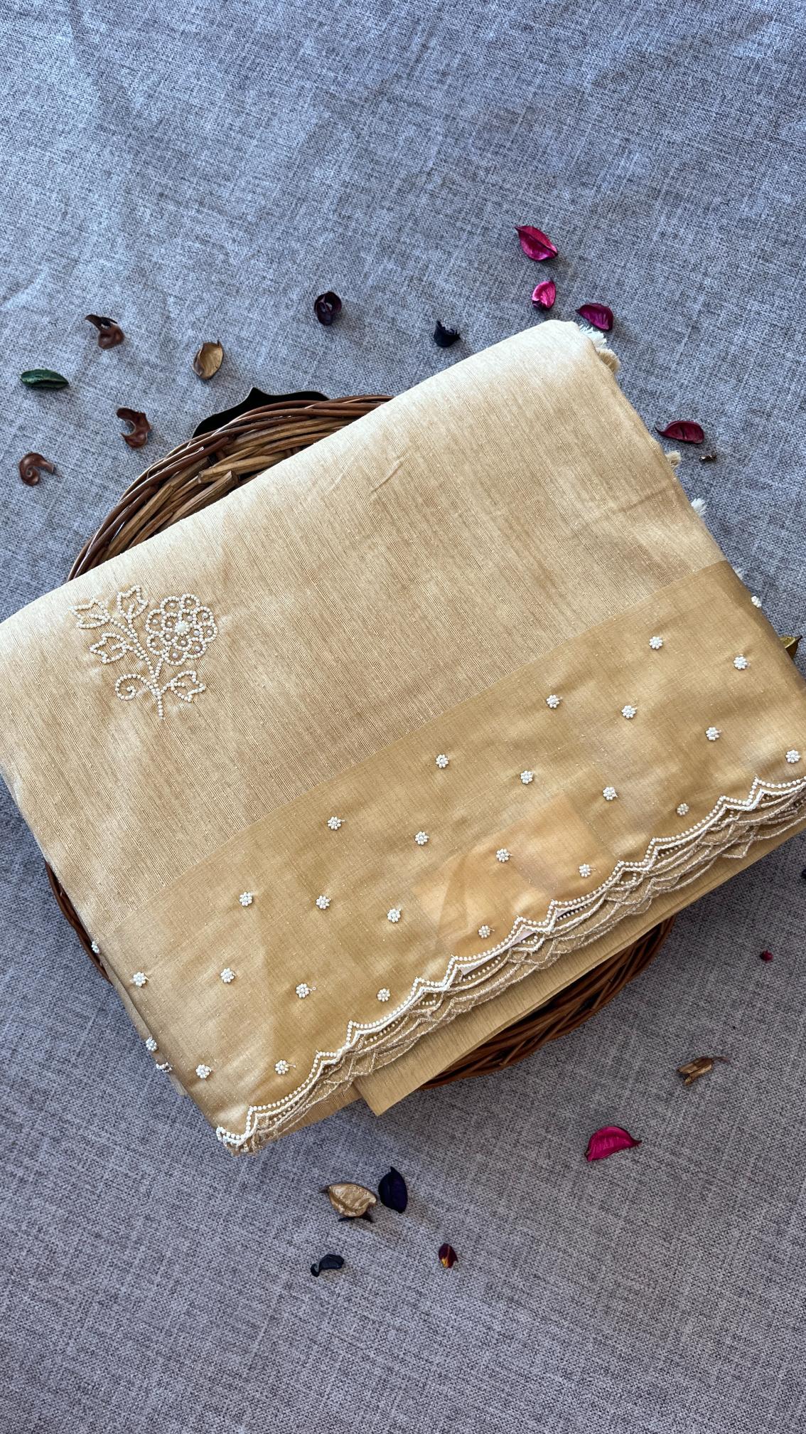 Elegant and timeless, this raw silk saree is beautifully enhanced with intricate hand-crafted bead work that adds a subtle touch of shimmer. The rich texture and graceful drape make it a perfect choice for refined and special occasions.