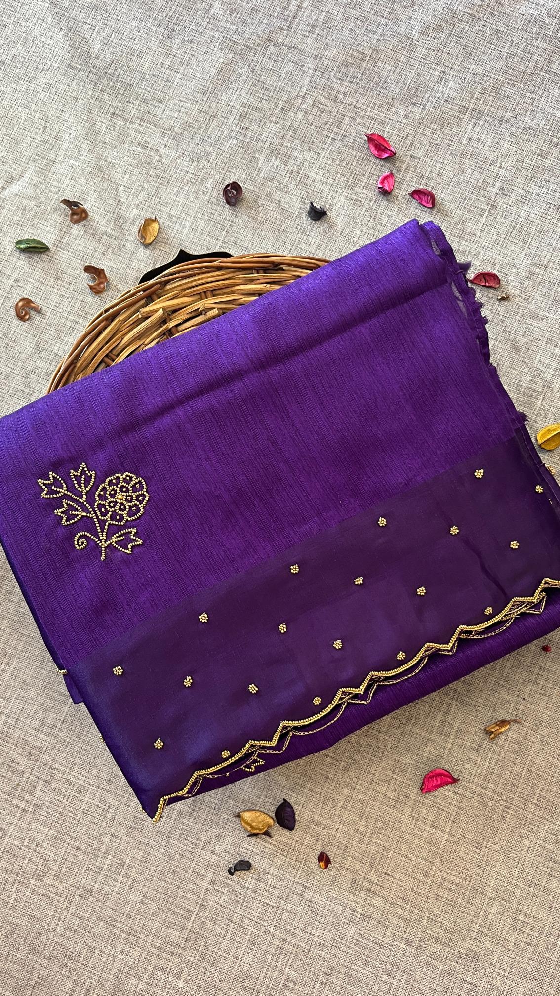 Elegant and timeless, this raw silk saree is beautifully enhanced with intricate hand-crafted bead work that adds a subtle touch of shimmer. The rich texture and graceful drape make it a perfect choice for refined and special occasions.