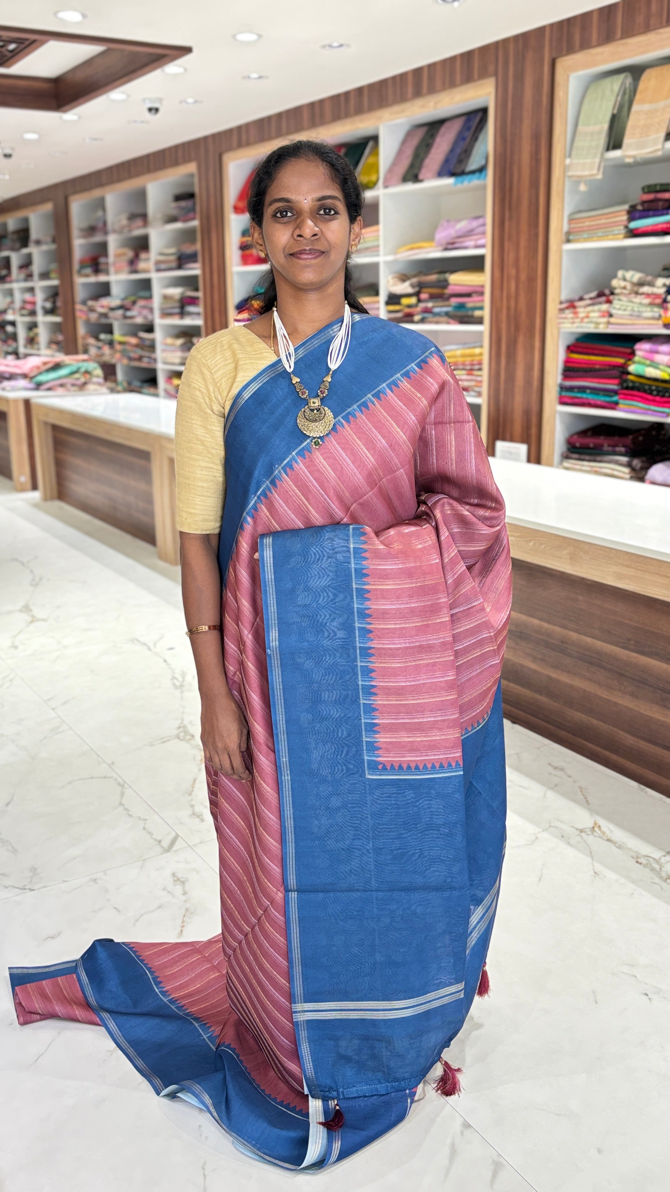 Crafted from premium semi tussar fabric, this saree offers a perfect balance of softness and structure with a subtle natural sheen. The fabric is lightweight, breathable, and easy to drape, making it ideal for long hours of wear while maintaining a graceful and polished look.