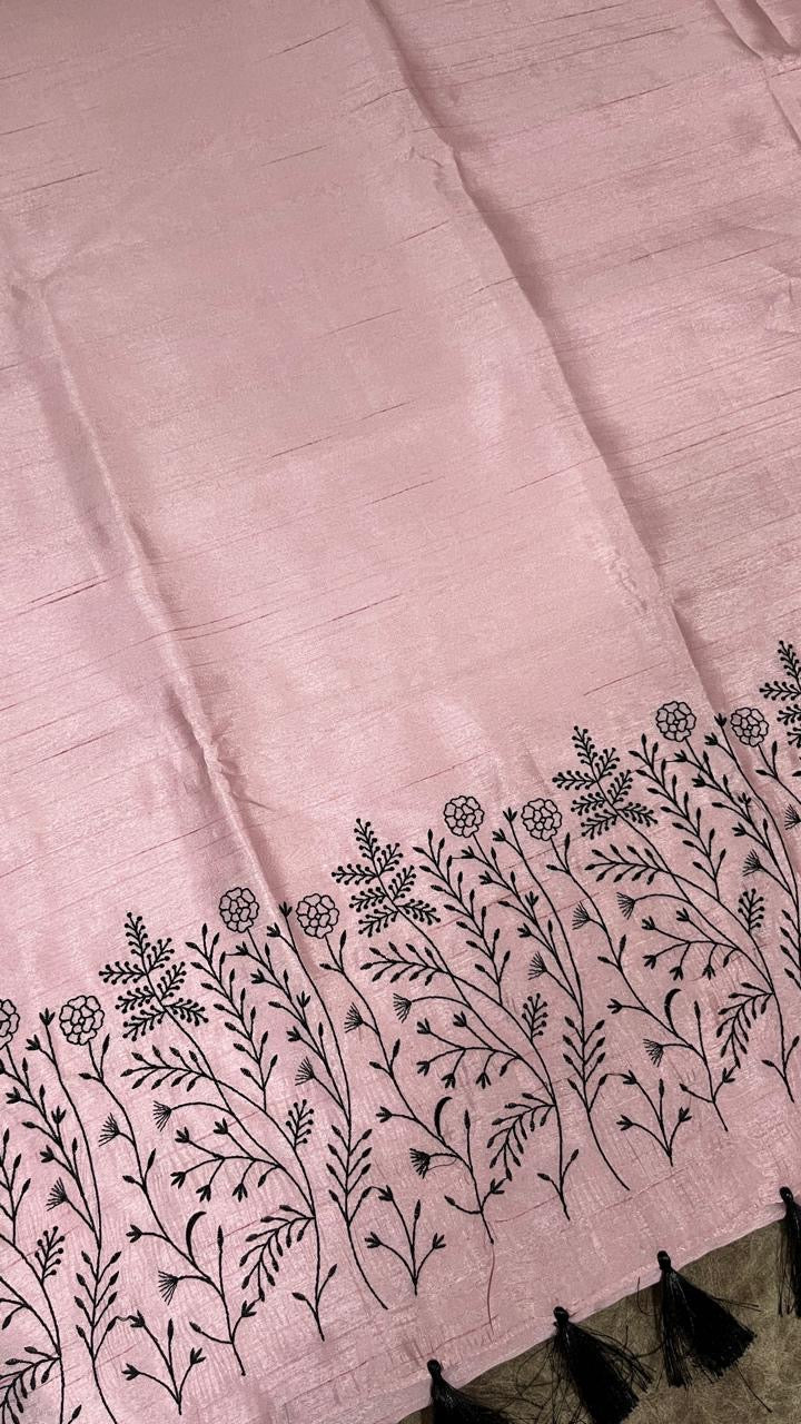 The saree features a soft blush pink body crafted in a subtle woven texture, enhanced with intricate black floral vine embroidery running along the border and pallu. The contrast black thread work adds a refined definition to the saree, creating a timeless and sophisticated look without overpowering its softness.